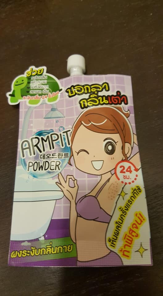 ซองสีม่วงคือผงแป้งกำจัดกลิ่น ที่ชอบคือเนื้อละเอียดมากๆเหมือนแป้งฝุ่นเด็กเลยไม่ระคายเคืองผิวไม่รู้สึกคันหรือแพ้ ซึ่งบางยี่ห้อจะเจอว่ามันมีสารส้มทำให้ฝืดผิวแห้งและคัน แต่ซองนี้ไม่เลยกลิ่นหอมอ่อนมากๆเนื้อผงไม่มีเม็ดหล่นลงไม่อุดตันไม่มีคราบทิ้งไว้ด้วย